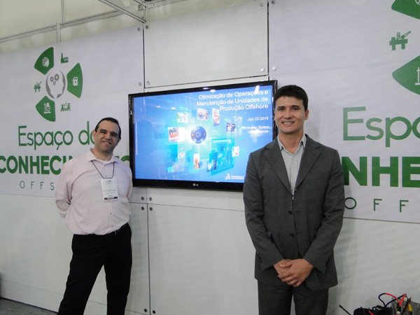 João Ferreira e Alexandre Tostes, da Dassault Systèmes, apresentaram palestra sobre otimização de operação de unidades de produção offshore, no Espaço do Conhecimento.
