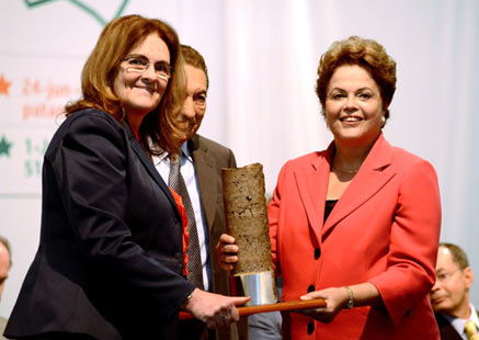Na cerimônia em que anunciou ter ultrapassado a média de 500 mil barris produzidos por dia no pré-sal, a presidente Dilma Rousseff disse que a Petrobras mostrou a incrédulos que o pré-sal é uma riqueza palpável e tangível que pertence ao povo brasileiro. "Eu acredito e sempre disse que a Petrobras, de uma certa forma, era a pátria, não de chuteiras, mas com as mãos sujas de óleo". Dilma também vaticinou que as vozes dos que querem diminuir a importância da Petrobras no cenário do petróleo brasileiro e internacional serão enterradas na imensidão dos mares. A produção de petróleo nos campos operados pela Petrobras nas áreas do pré-sal nas bacias de Santos e de Campos atingiu 520 mil barris por dia há uma semana. Desse total, 406 mil barris correspondem à parcela da Petrobras e o restante às petroleiras parceiras. Segundo o diretor de exploração e produção da Petrobras, José Formigli em 2020 a área responderá por 53% da produção nacional, com 2 milhões de barris/dia. |