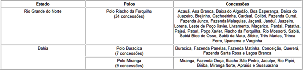 34 concessões estão localizadas no Polo Riacho da Forquilha, no Rio Grande do Norte, enquanto na Bahia são sete concessões no Polo Buracica e outras nove no Polo Miranga. No total, os campos produziram 20,4 mil barris de óleo equivalente por dia em 2016.