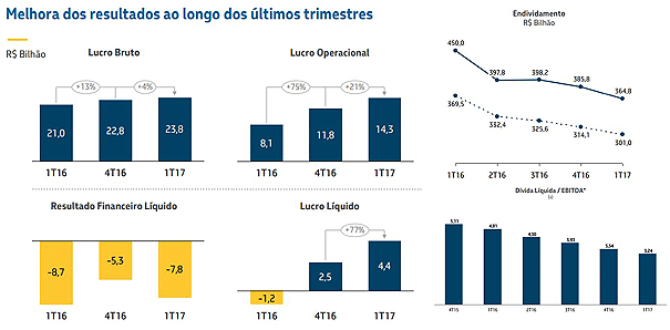 O endividamento, no entanto, ainda é alto: R$ 300,975 bilhões, 3,24 vezes o Ebitda, longe da meta estabelecida de 2,5 vezes para ao fim de 2018.