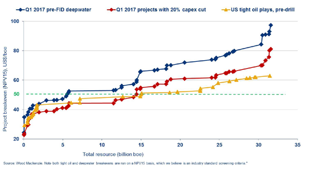 A Wood Mackenzie estima que uma redução adicional de 20% nos custos atuais de águas profundas traria atratividade para 15 bilhões de barris de reservas.