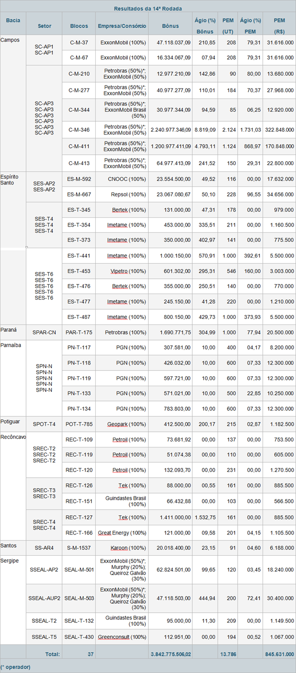 A 14ª Rodada de Licitações registrou uma arrecadação de R$ 3,8 bilhões com o bônus de assinatura de 37 blocos. Sozinha, a Bacia de Campos respondeu por 95% desse valor. Oito blocos localizados em águas profundas foram arrematados por Petrobras e Exxon – em um deles, o consórcio ofereceu um ágio de 8.819%, bem acima das ofertas das concorrentes Shell, Repsol, CNOOC, Total e BP.